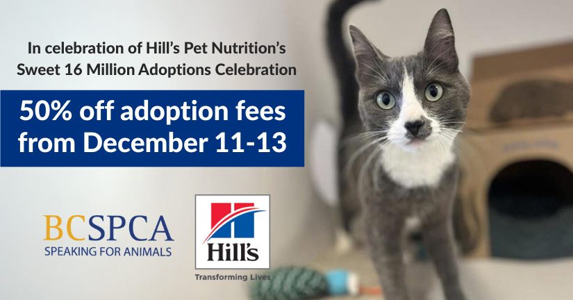 50% Adoption Fees: Hill’s Pet Nutrition is helping more animals find their loving home this winter. Reduced adoption fees available December 11-13th.